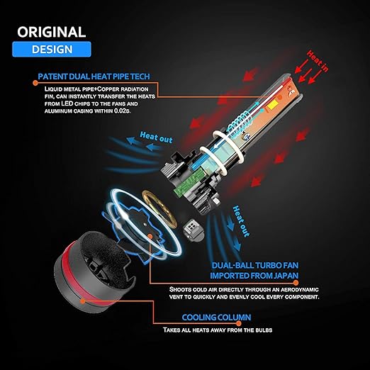 - Efficient Cooling System for Longevity – The Fin + High-Speed Fan Cooling System ensures efficient heat dissipation, coupled with CopperTube cooling technology. This allows the headlights to run at lower temperatures, extending their lifespan to an impressive 50,000 hours, which is 10 times longer than traditional HID xenon lights.